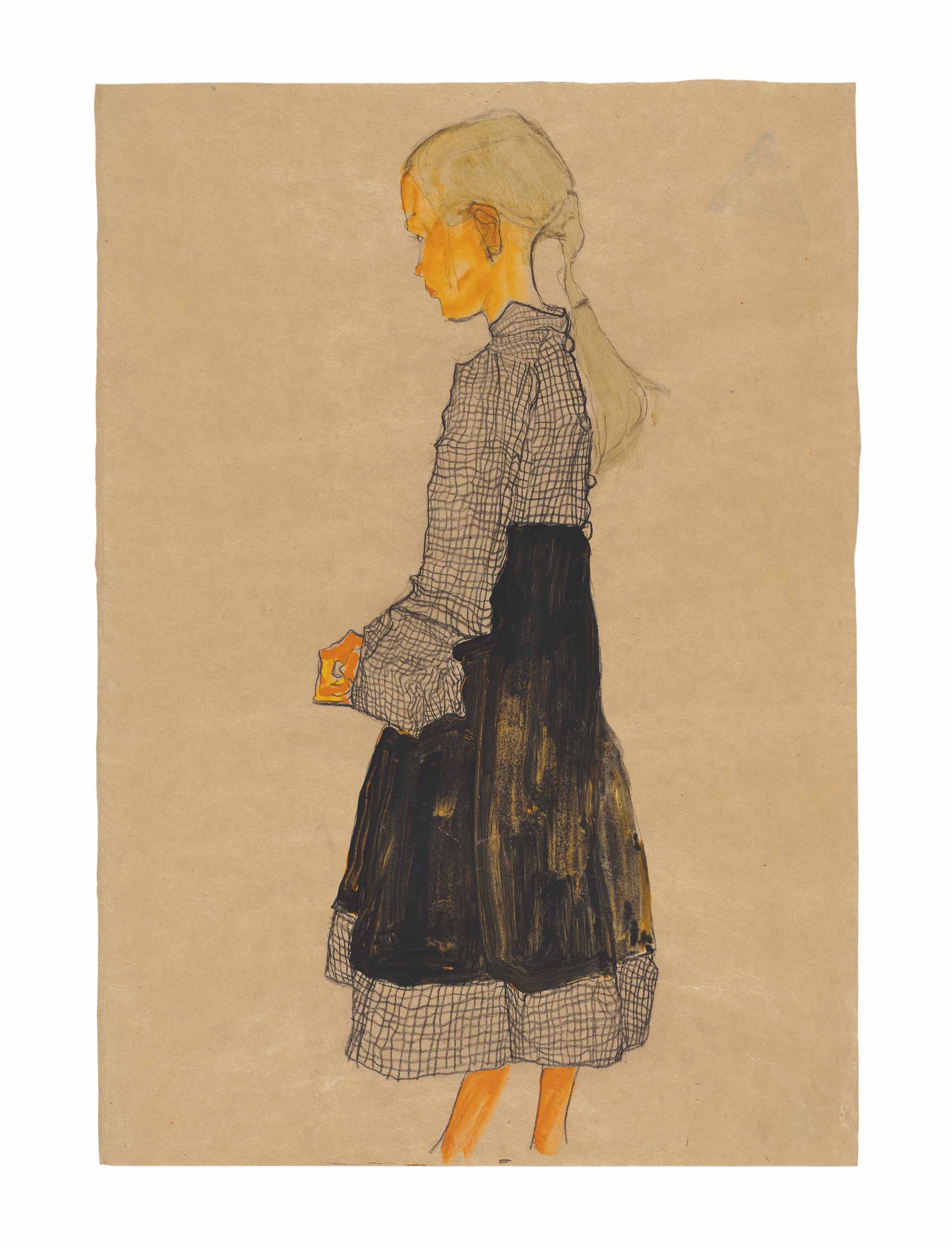 Oesterreichisches Mäderl dates from this groundbreaking year in the short yet prolific life of the artist. With vivid orange flesh, the young, blond-haired girl is clothed in a black and white checked dress, its fabric rendered so vividly with a mass of crisply crossing lines that every crease and fold seems to pulsate on the surface of the paper. One of a series in which Schiele took as his models the young street children of Vienna’s slums, Oesterreichisches Mäderl encapsulates the bold, artistic experimentation that defines the artist’s work from this year; indeed, Jane Kallir has described this series as being among the artist’s ‘first true Expressionist portraits’ (J. Kallir, Egon Schiele Drawings and Watercolours, London, 2003, p. 78).