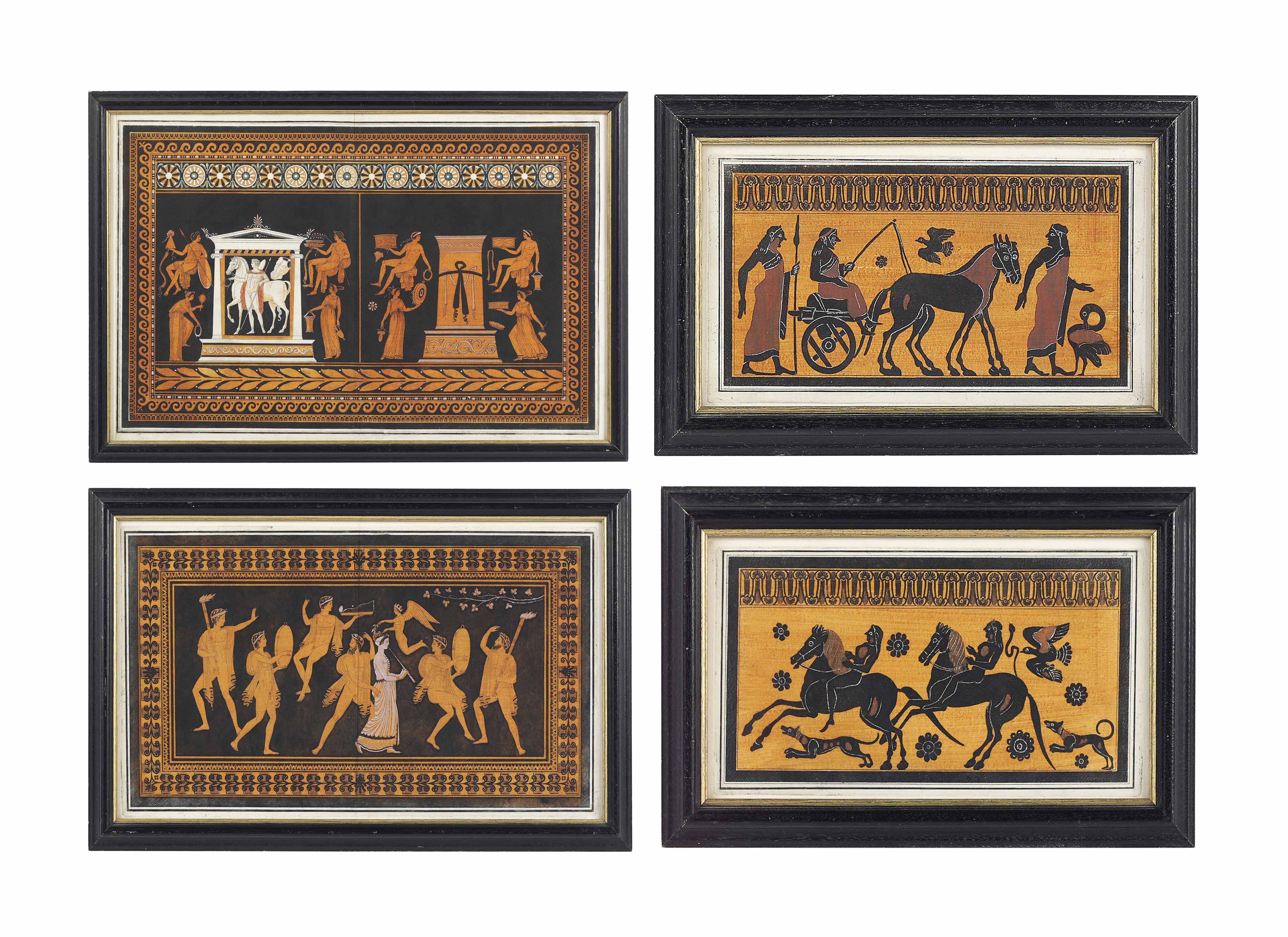 FOUR COLOURED ENGRAVINGS OF MOTIFS FROM THE VASES IN THE COLLECTION OF SIR WILLIAM HAMILTON