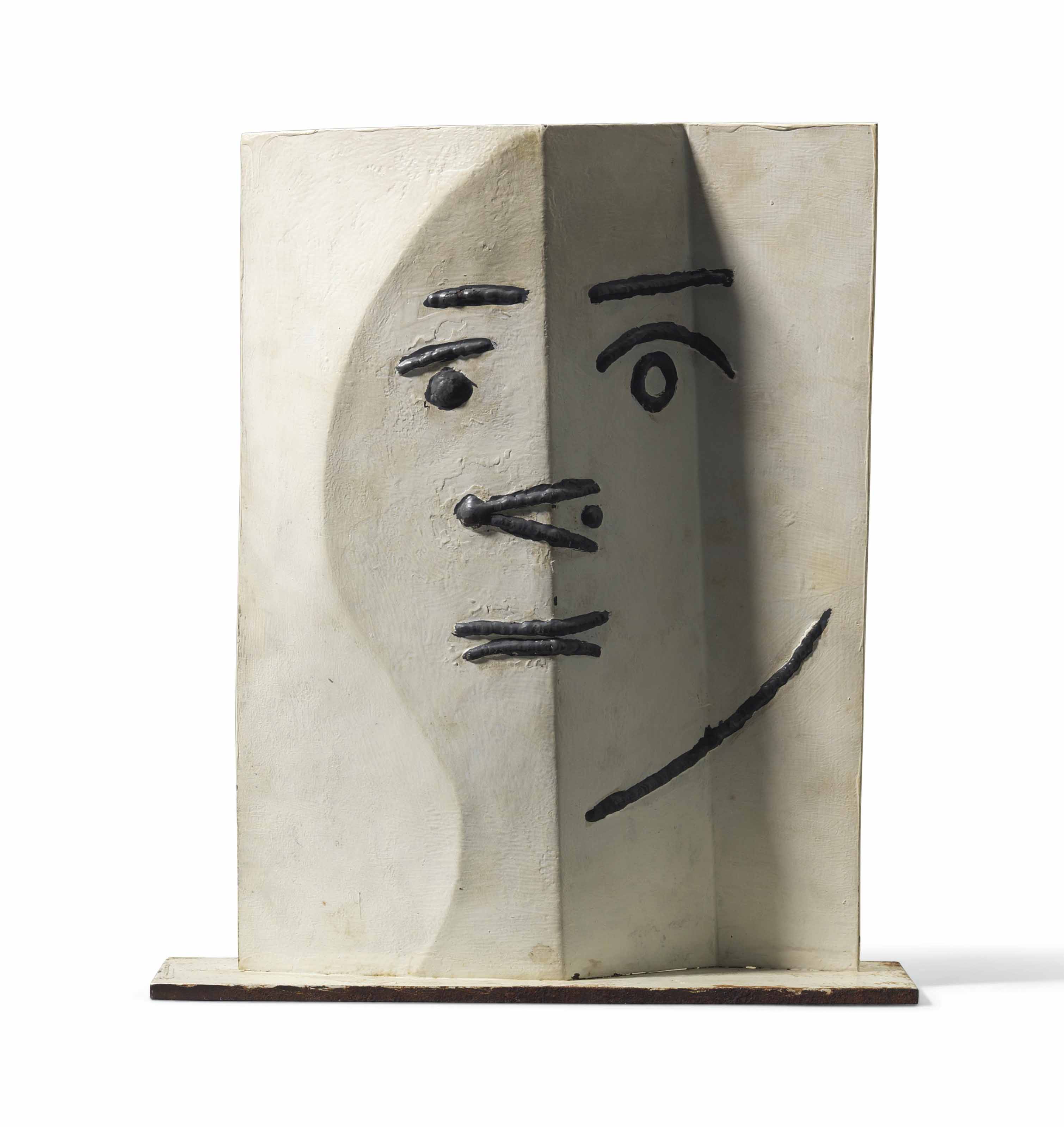 Executed in 1961, Tête is rendered from a single piece of folded, white painted sheet metal, onto which a series of striking black lines outline the minimal features of a face. One of a series of works in which Picasso designed paper maquettes, which were then recreated exactly into sheet metal, Tête dates from one of the most prolific phases of sculptural activity in the artist’s career. From heads and profiles of his great love and muse, Jacqueline, to animals and objects, between 1960 and 1961, Picasso made over 100 of these playful, experimental and personal works, which he treasured and seldom sold during his lifetime.