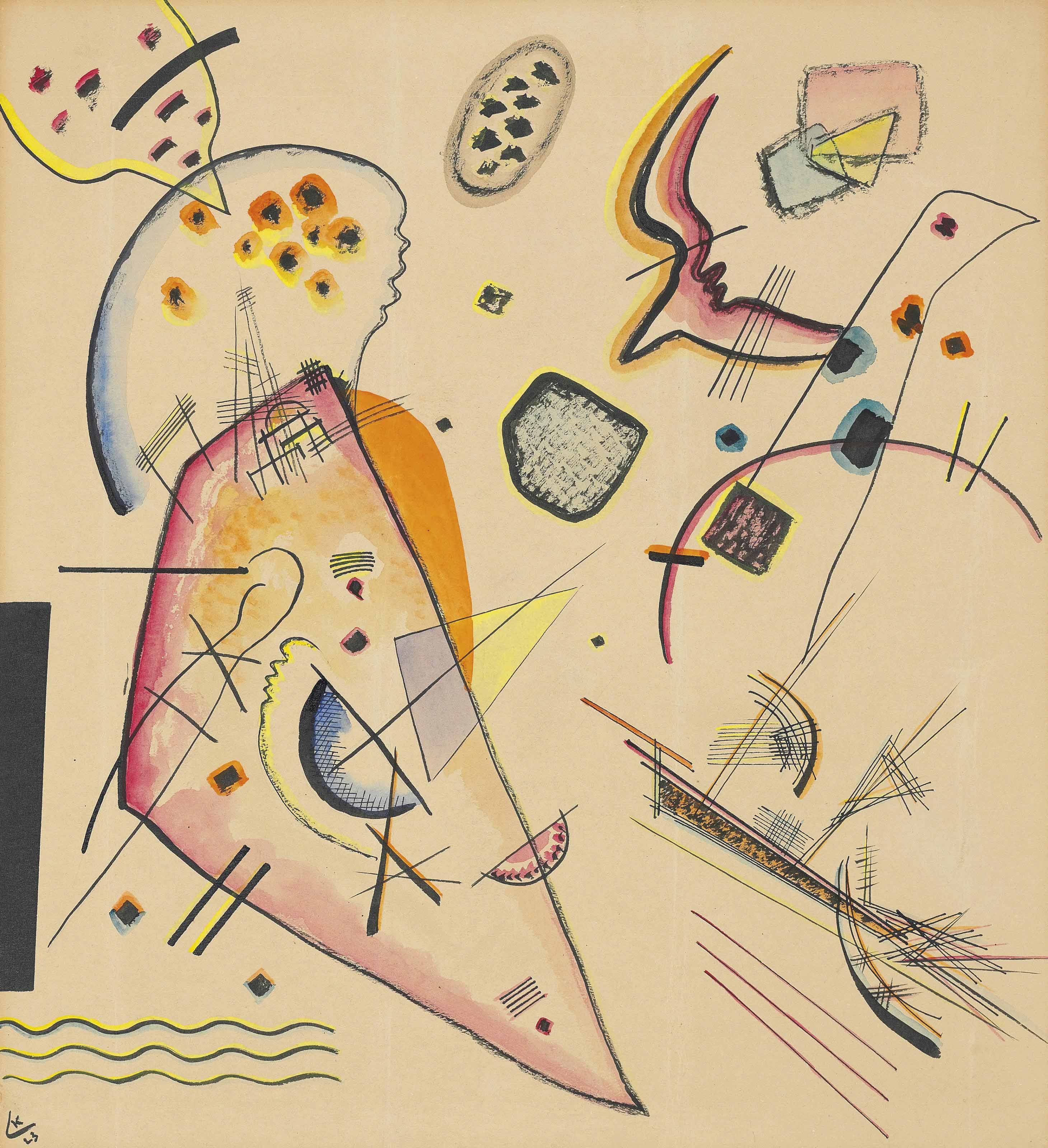With its lyrical, abstract forms and delicate washes of colour, Ohne Titel embodies many of the key elements which defined Wassily Kandinsky’s approach to abstraction in the early 1920s, and represents his transition to a new style of painting which would occupy him throughout the rest of the decade. Believed to have been created as a study for the lost oil painting Weisses Bild, this work demonstrates the close connection between Kandinsky’s oils and watercolours during this period, as he worked across different media to develop his artistic theories. Executed during the artist’s first year of teaching at the Weimar Bauhaus, this richly detailed watercolour is, like many compositions from this period of Kandinsky’s career, an exercise in exploring the interdependent relationships that emerge from the careful orchestration of abstract shapes and colours. The painting is filled with a series of interlocking geometric and amorphous forms, outlined in strokes of varying thickness and highlighted with shades of vibrant colours.